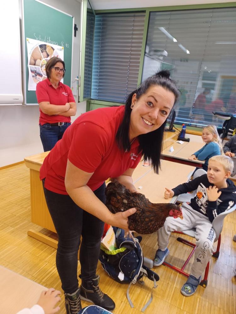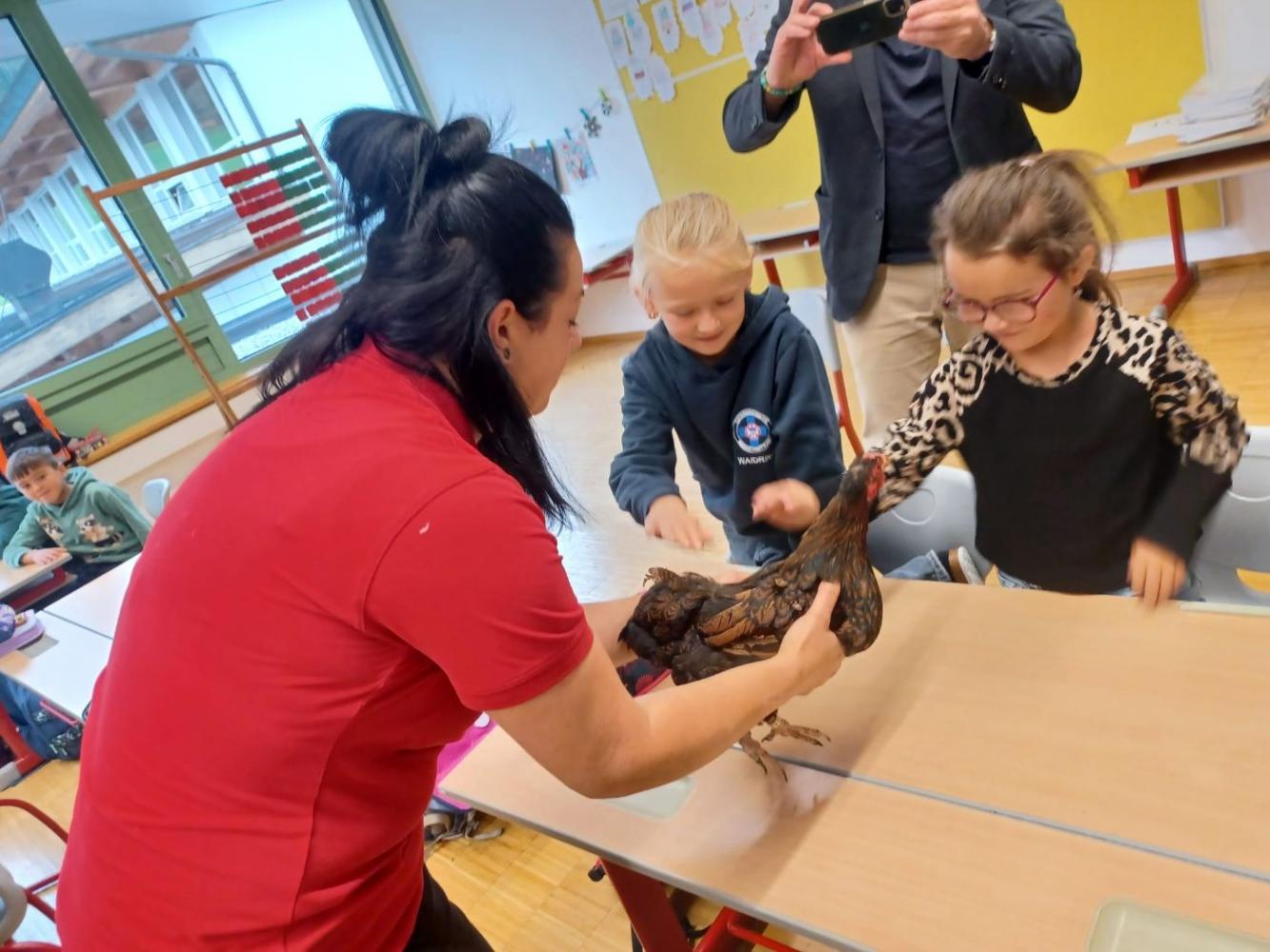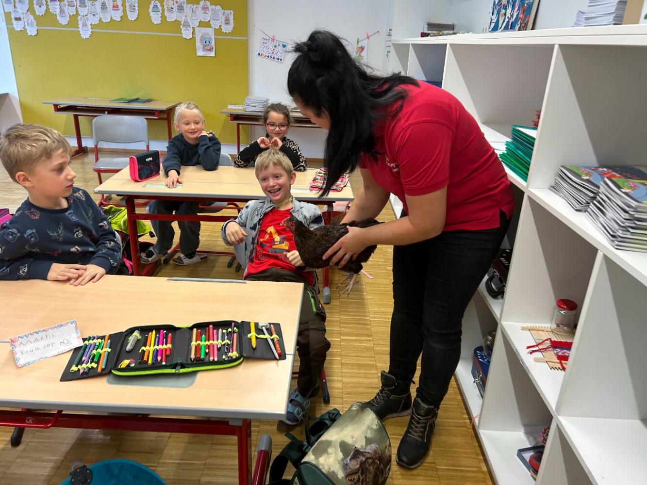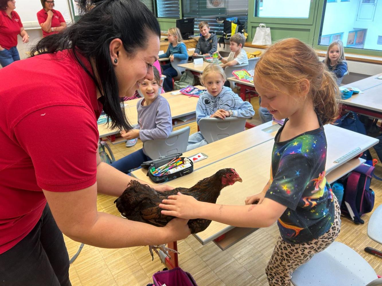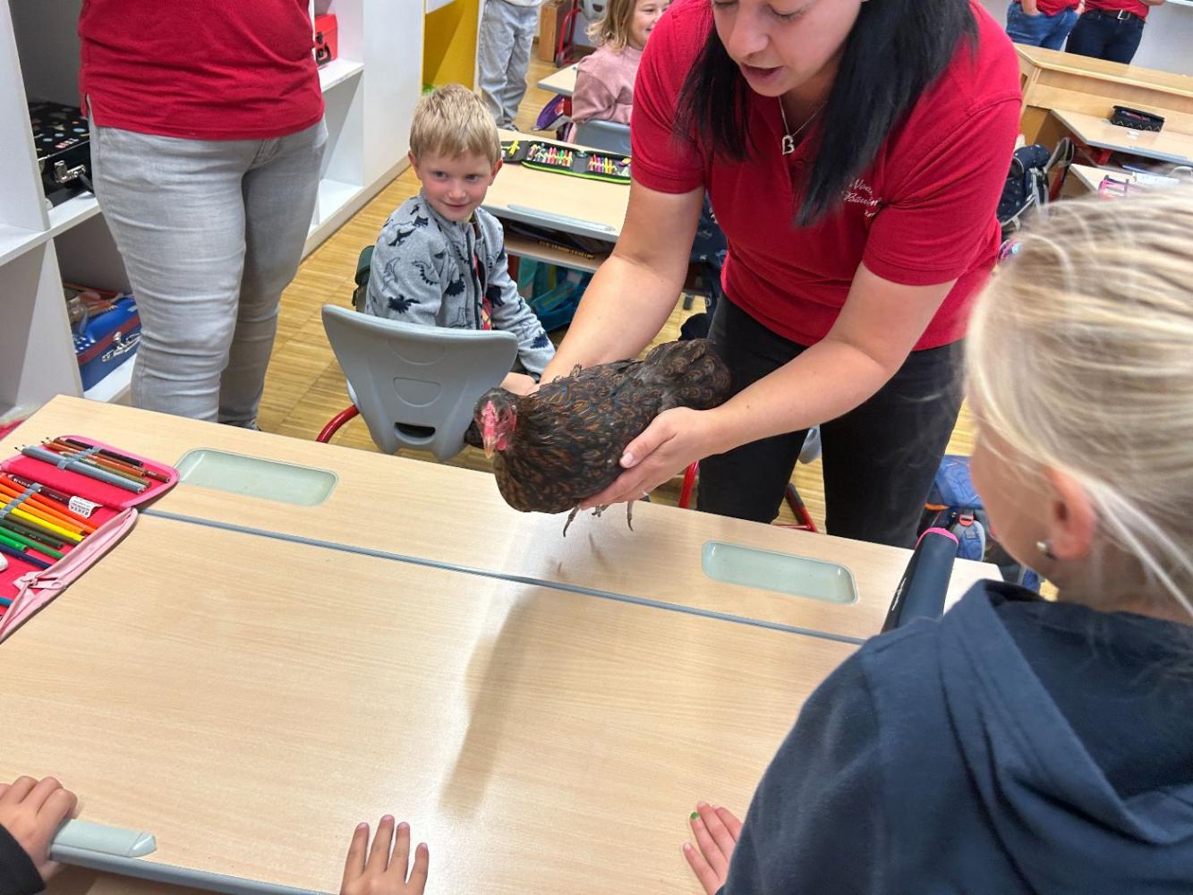 Das Beste: Eine echte Henne war auch mit dabei! Die Kinder durften sie streicheln – auch wenn sie ein bisschen aufgeregt war und ständig gackerte. Hat der Henne das Streicheln wohl gefallen?